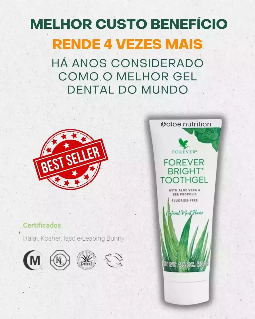 Este gel dental inovador é feito com gel de aloe vera estabilizado dos próprios campos da Forever e pode ajudá-lo a combater a placa bacteriana como parte de uma rotina de escovação regular. Forever Bright® também contém própolis de abelha, que demonstrou ajudar a promover a saúde das gengivas e prevenir o mau hálito.